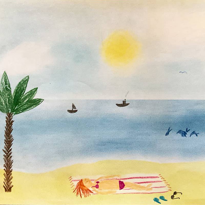 Sonne, Wolken und die Strandmatte wurden mit dem Radiererstift freigelegt, bevor mit Buntstiften Details wie Palme, Boote, Vögel und die liegende Person ergänzt wurden.