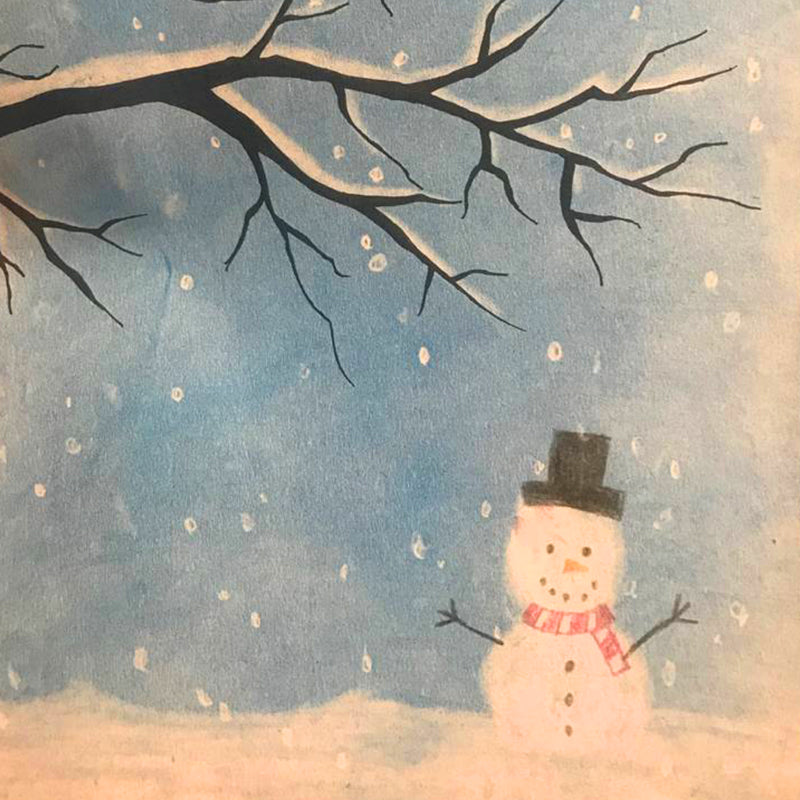 Für Konturen lassen sich die Farbstäbchen wie Stifte verwenden. Die Zweige können mit schwarzem Farbstäbchen oder, wie hier im Bild, mit Filzstift gezeichnet werden. Auch ein Radierer kann effektvoll eingesetzt werden. Die Zweige werden zunächst mit dem schwarzen Stift vorgezeichnet. Anschließend wird über das ganze Bild blaues Seccorell-Pulver gestreut, eingerieben und gut(!) mit dem Wattepad einpoliert. Zum Schluß werden Schneeflocken, Schneeflächen und Schneemann herausradiert und kleine Details zeichnerisch ergänzt.