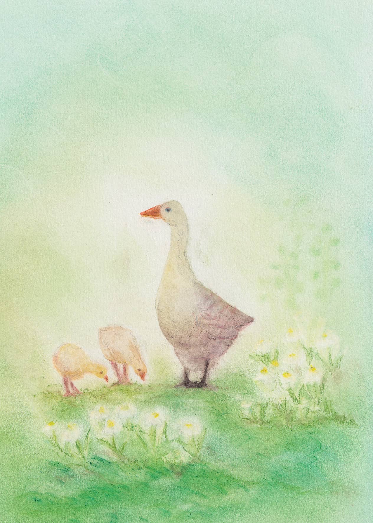 Die Darstellung der kleinen Gänse-Familie inmitten von Blumen stammt von Andrea Reiß. Gefertigt in der Seccorell Finger-Wischmaltechnik, eignet sich diese Karte gut für Grüße zum Frühling, zur Geburt oder einfach als liebevolle Nachricht.