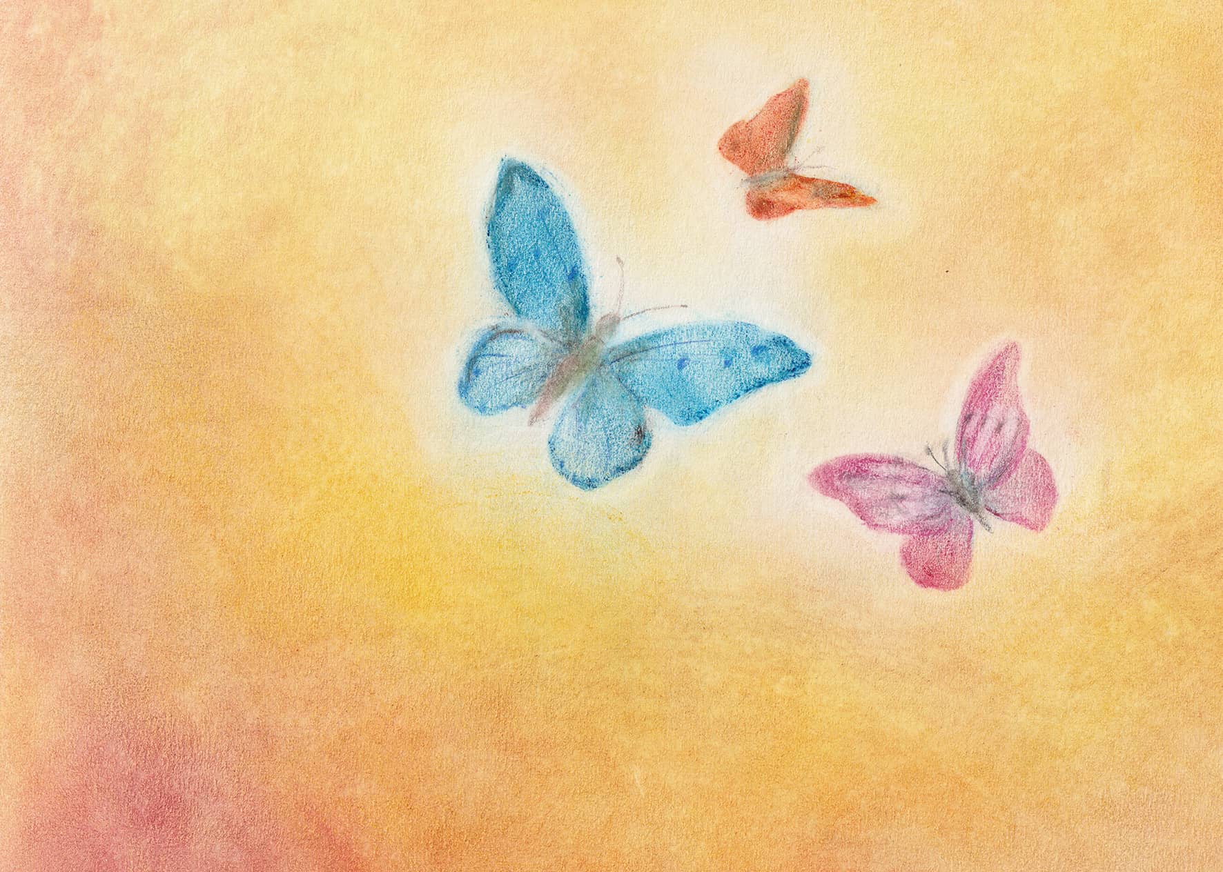 Drei Schmetterlinge fliegen in einem sonnigen Himmel. Dieses heitere Motiv stammt von der Künstlerin Andrea Reiß und wurde in der Seccorell Finger-Wischmaltechnik gestaltet. Die Karte eignet sich hervorragend für Frühlings- und Sommergrüße oder als leichte und freundliche Mitteilung.
